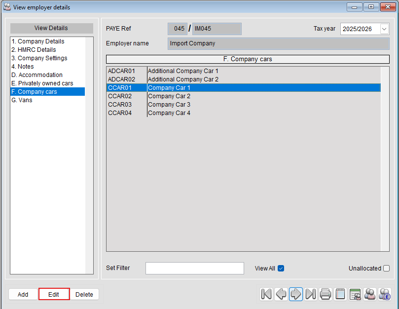 From the employer screen, select the Company Cars section: